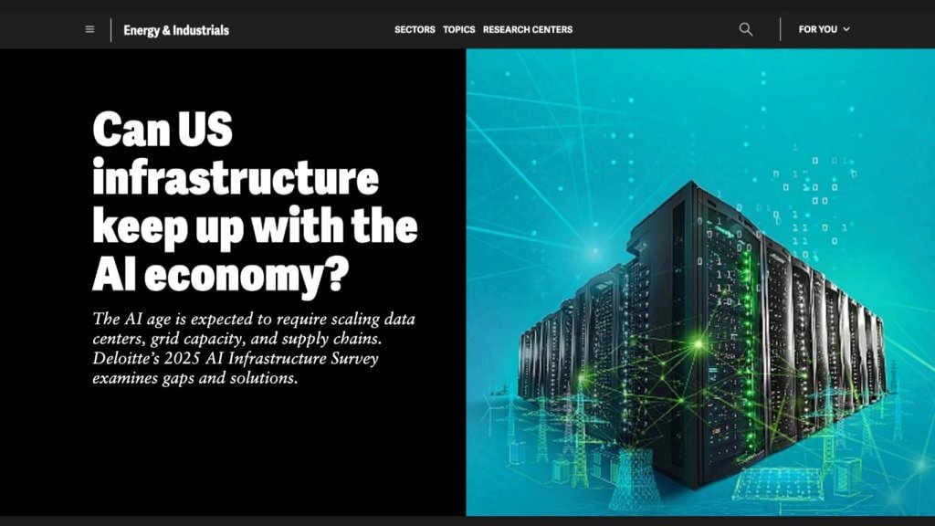 We believe Deloitte’s “Can US infrastructure keep up with the AI economy?” articulates a central constraint to our thesis: Energy and water availability – and the speed of grid expansion – will set the pace of the buildout.