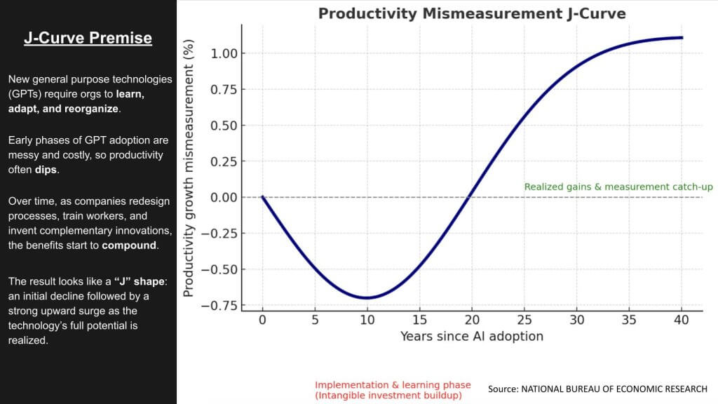 The productivity J-curve is a phenomenon where traditional measures of productivity growth initially dip before rising after the adoption of a new general purpose technology (GPT). This occurs because a novel technology, like AI, requires significant, but hard-to-measure, intangible investments in areas like employee training and business process redesign. These initial investments can cause temporary negative productivity impacts, but once organizations learn to productively apply the technology, full benefits are realized and productivity growth appears, often in quite dramatic fashion.