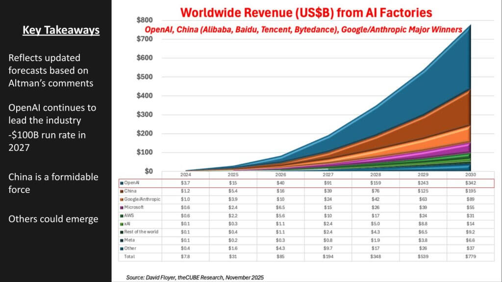 - Mainstream enterprise revenue is largely indirect: Most organizations consume AI via APIs rather than building out massive AI factories; revenue concentrates with factory operators (hyperscalers, neoclouds, OpenAI, Chinese majors, and a handful of others).