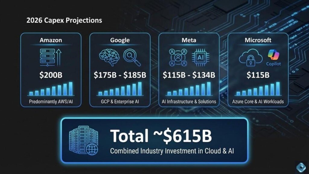 We believe the market is recalibrating to the scale of what is underway. The numbers are extraordinary. When you add up the big players, we are talking about roughly $615 billion in CapEx spend in the coming year. Most of that is aimed squarely at cloud and AI. Put that on top of more than $300 billion and change last year and the step up is more than concerning to observers.