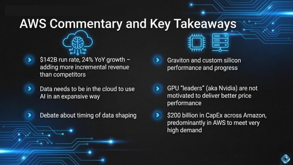 That brings us back to CapEx. AWS is building at a scale that forces hard choices, and the silicon strategy is an attempt to control unit economics and reduce dependence on a single supplier. The question investors are really asking is how quickly that CapEx converts into sustainable monetization and whether the custom silicon strategy improves margins over time.