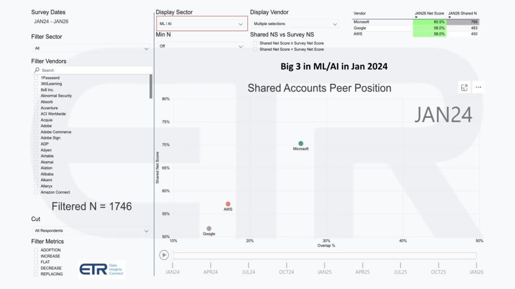 We believe the driver is AI and machine learning, and the follow-on charts below reinforce this. In the ETR data set, for the machine learning and AI sector, Google moves from trailing AWS on overlap (first chart below – Jan 2024) to overtaking it (second graphic – Jan 2026), with comparable spending momentum in the high-50s and Microsoft higher in the mid-60s.