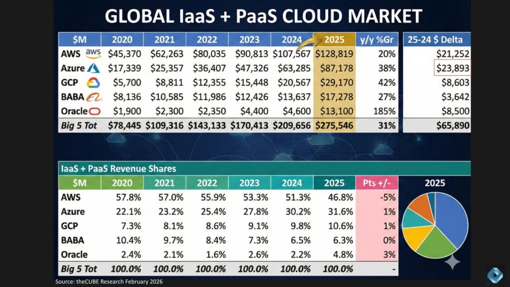 The scale of the market remains staggering. AWS comes in at $129 billion in IaaS and PaaS revenue for 2025, and the quarter’s growth rate was 24%. That keeps AWS as the largest player by a wide margin.