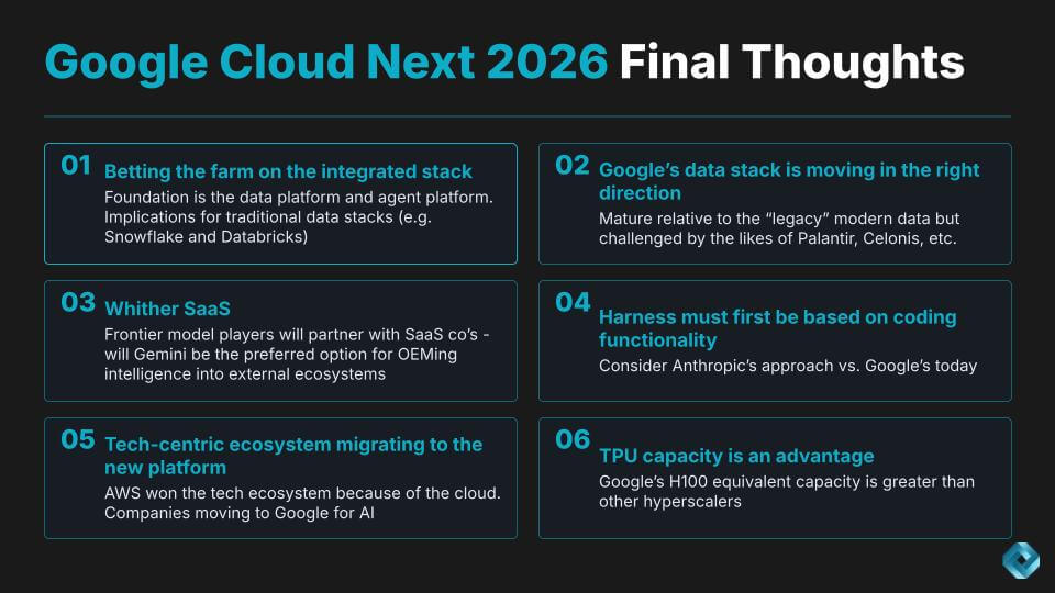 Takeaway – TPU 8 is the headline, but the more important story is Google’s attempt to connect its silicon, data platform, and frontier model posture into an integrated agent platform narrative.