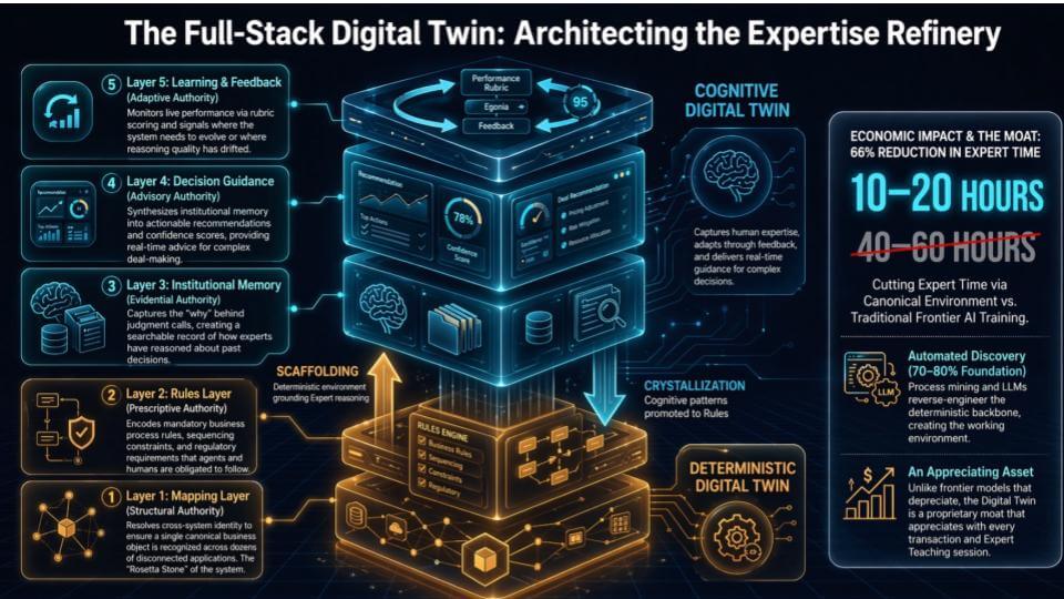 That’s why the slide above separates the deterministic digital twin (the orange/gold “scaffolding”) from the cognitive digital twin (the blue “crystallization”). The deterministic layer is the governed backbone. The cognitive layer is how the organization captures the “why” behind decisions and learns over time.