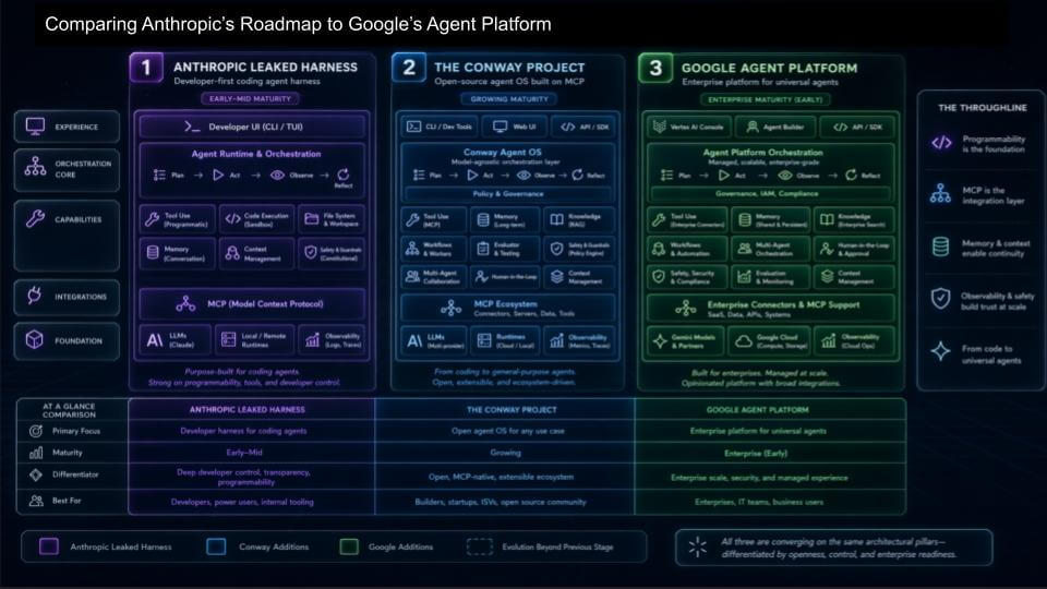 Anthropic’s early advantage is that “coding first” path is the fastest way into general-purpose agent behavior. The harness gives developers a high-control environment – UI/CLI, orchestration, tool use, context management – and it becomes the training ground for what later turns into broader knowledge-work agents. Their Conway work is the logical next step – an attempt to assemble a fuller platform on top of MCP, with proprietary extensions and enterprise features that go beyond pure coding.