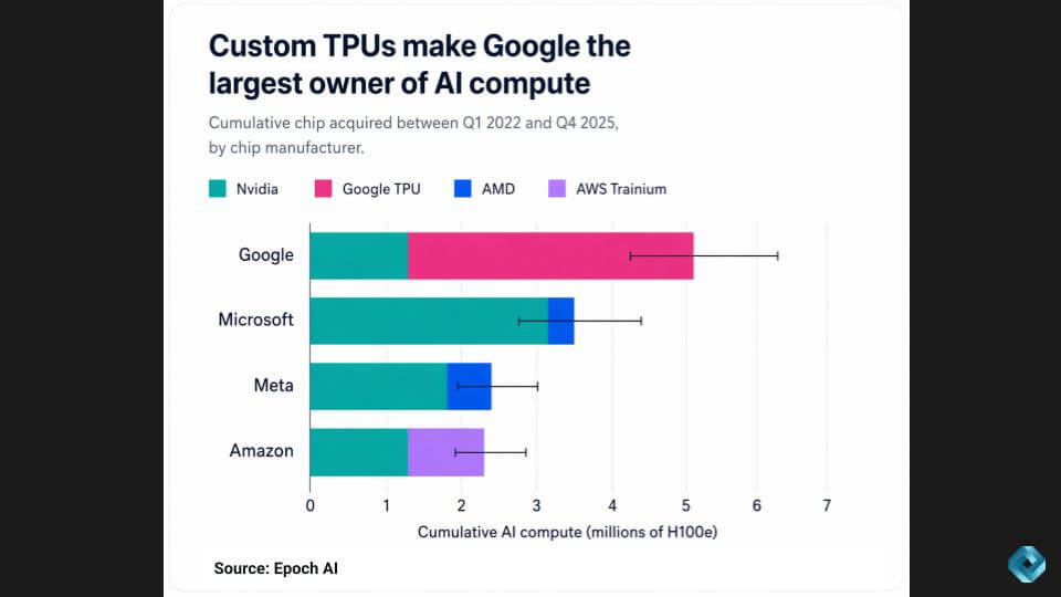 The Epoch AI chart on “H100 equivalent” capacity below suggests Google has more AI compute than any other cloud, driven largely by TPUs – a brute-force approach compared to Nvidia, but one that lets Google control its own destiny on supply and deployment.