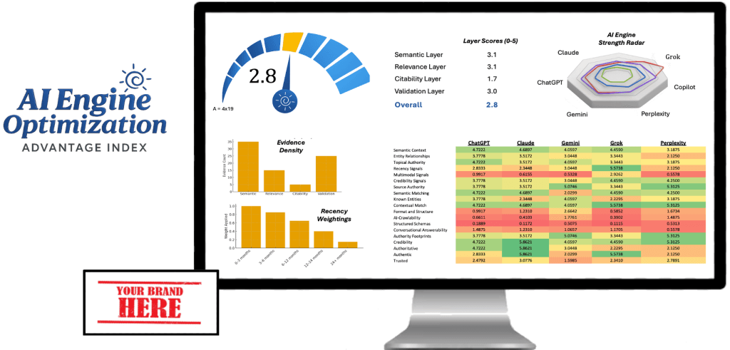 It complements the AEO Advantage Index’s scorecards, evidence logs, and action plans with real-world visibility data, showing how brands are actually being learned, ranked, and recommended by AI systems. In essence, it’s where AEO strategy meets execution, CAAT-compliant content, earned media, and thought leadership to build lasting brand equity within AI engines.