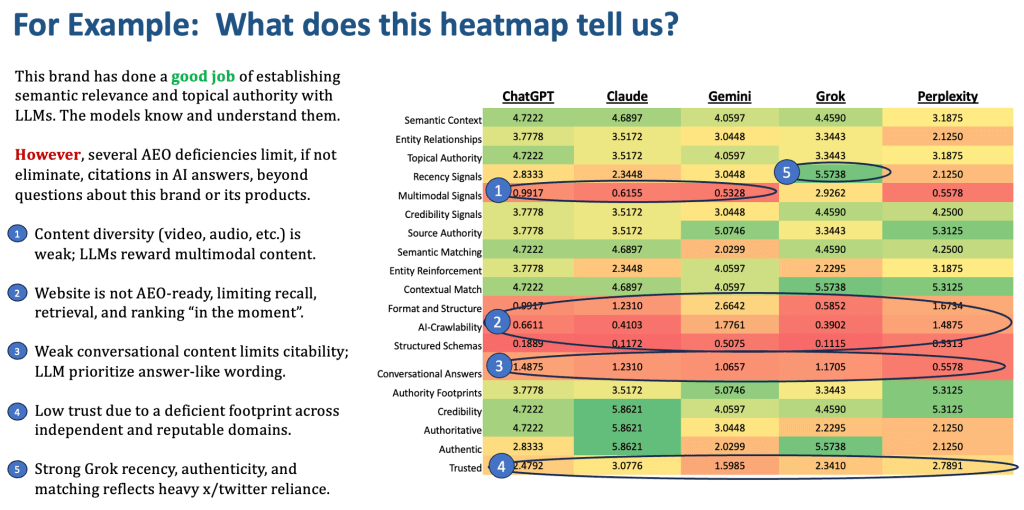 Equally important, AI discovery does not occur within a single model. Buyers depend on multiple AI assistants, each with different retrieval methods, authority levels, and knowledge frameworks. The AEO Advantage Index measures visibility across top AI engines (ChatGPT, Claude, Gemini, Grok, Perplexity) and standardizes results among them. This multi-engine approach reduces bias, highlights inconsistencies, and ensures organizations develop durable visibility across the AI ecosystem instead of optimizing for a single AI engine.