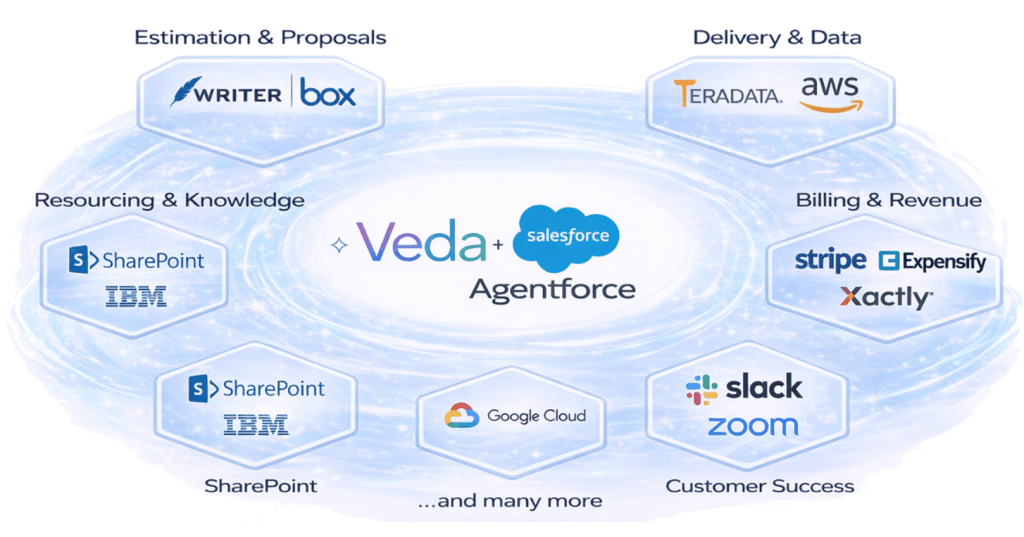 This means Veda’s 10 specialist agents and 64+ intelligent actions are natively discoverable, deployable, and billable through the unified AgentExchange marketplace — a single catalog of 10,000+ Salesforce apps, 2,600 Slack apps, and 1,000+ Agentforce agents, sub-agents, tools, and MCP servers with integrated billing and one-click activation. Because Agentforce added native support for MCP and A2A — open standards that let AI agents access information and collaborate regardless of the platform they’re built on Salesforce, Veda agents can call out to partner MCP servers across the ecosystem, and, just as importantly, be invoked by external agents.