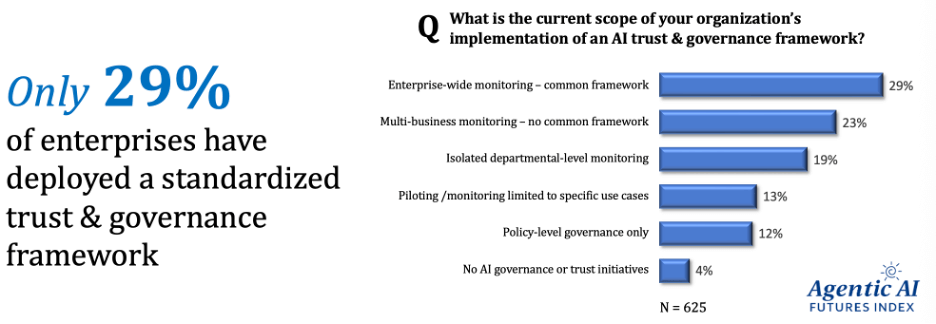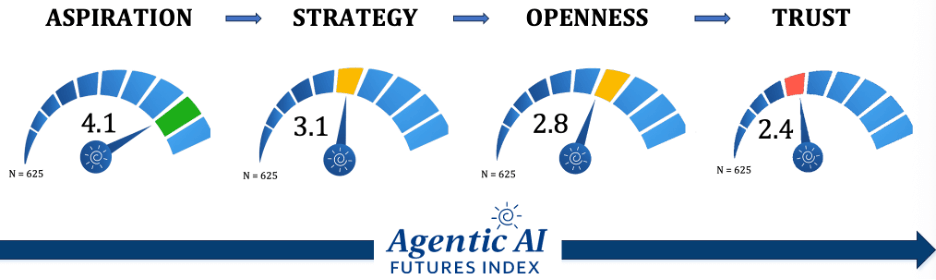 Our September 2025 Agentic AI Futures Index survey, conducted with 625 pre-qualified AI business and tech professionals across 13 industries, highlights the strategic nature of IBM’s PoV. It found a sharp decline in maturity as organizations shift from aspiration to trusted execution, exactly what IBM is investing to address: