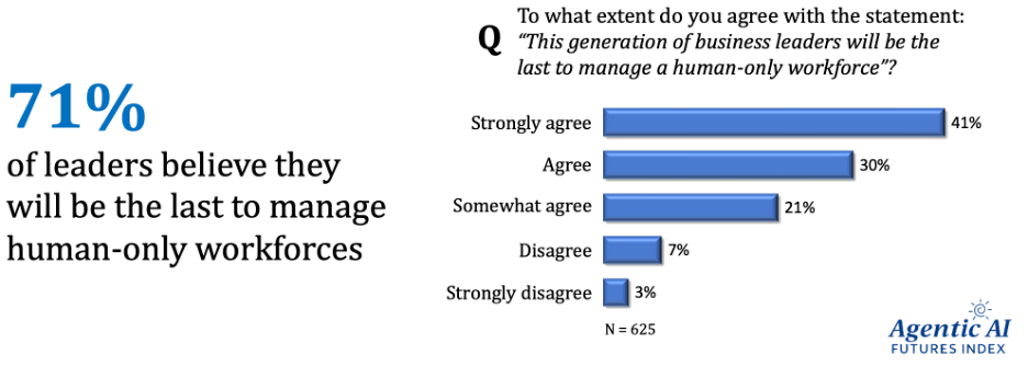 - Aspirations are high (4.1 score): 90% of leaders are enthusiastic about the transformative nature of agentic AI-enabled digital labor.