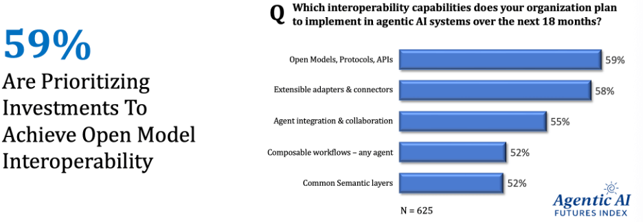 - Openness is core (2.8 score): 57% are investing in achieving open interoperability across their agentic enterprises.