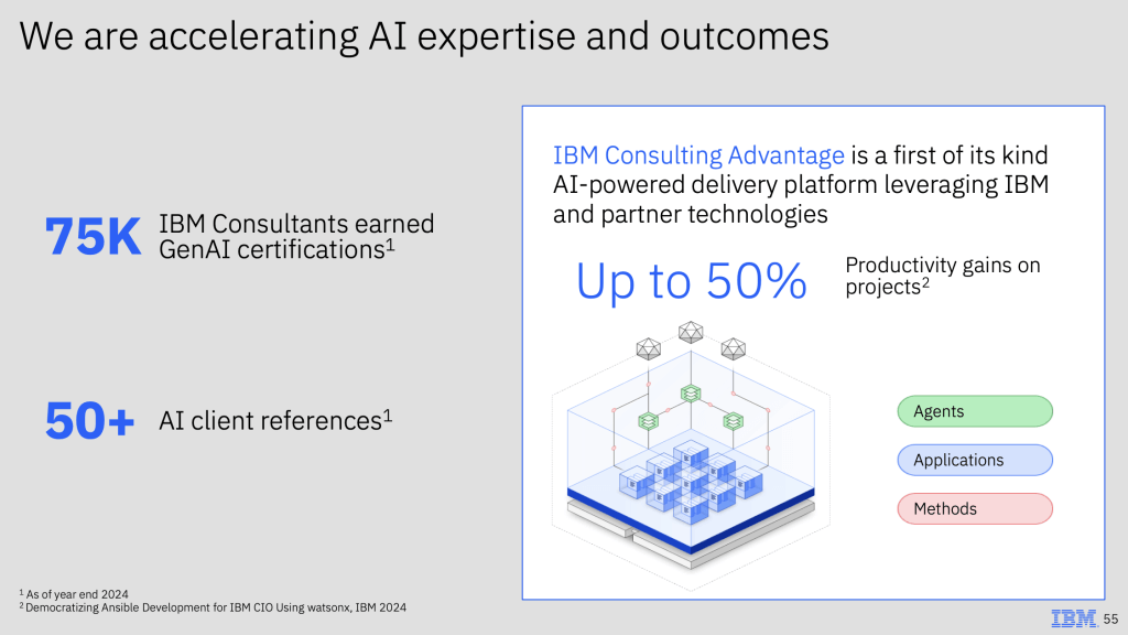 In our view, IBM Consulting’s pivot from people-led projects to “human + digital labor” is the right strategy and key to the future of its business. The firm’s Consulting Advantage assets – which it claims have been sold into more than 500 deals over the past year – are the mechanism IBM is leveraging to turn expert know-how into reusable software, moving clients from technology pilots to outcomes. Under the leadership of Mohamad Ali, IBM’s own “client zero” story adds to its credibility where management decomposed 490 workflows, instrumented ~70 with digital workers, unified ~300TB of finance/ops data, and claims $3.5B in productivity gains alongside a revenue inflection (from –3% to +5%) and 200 bps margin expansion in 1H.