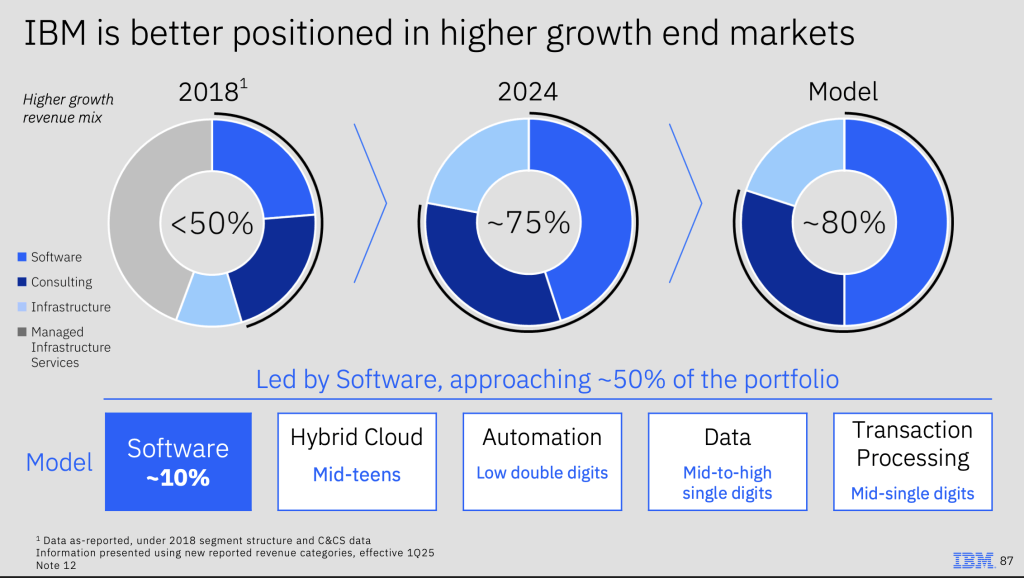 IBM’s operating mix still contains a healthy mix of consulting but software growth is outpacing the mean with a double digit growth target. As shown below, IBM’s financial framework calls for software to contribute approximately 50% of the revenue mix (bright royal blue below).