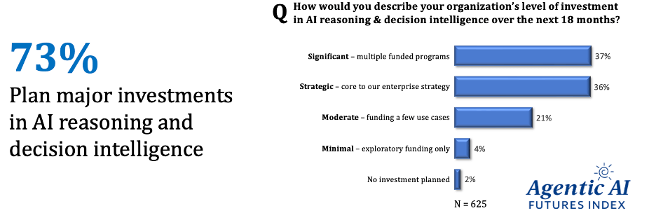 Our Agentic AI Futures Index survey of 625 enterprise professionals involved in agentic AI initiatives highlights this shift: 73% plan to invest in AI reasoning and decision-making capabilities over the next 18 months, and more than one-third see this as a strategic necessity. The reason is straightforward: enterprises are looking for higher-ROI use cases, especially in knowledge work, where AI agents can handle ambiguity, interpret context, and assist humans in making better decisions instead of just automating repetitive tasks within workflows.