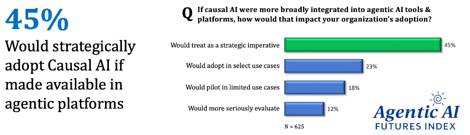 If successfully executed, Salesforce can progress beyond its CRM heritage to become the decision-intelligence backbone of the enterprise, where reasoning, judgment, and trust come together to produce outcomes that are not only faster but also smarter and demonstrably justified. This is the future of agentic AI, and it’s available to take. The market needs and desires genuine semantic and causal reasoning to support the workforces of the future. As shown in the Agentic AI Futures Index, those involved in enterprise agentic AI initiatives understand and would embrace causal AI techniques if they were made accessible within agentic AI platforms and tools.