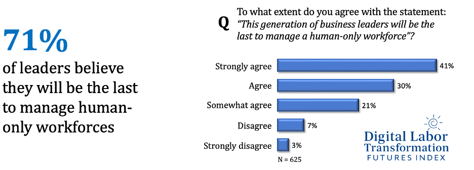 The data from our recent Digital Labor Transformation Index survey shows that this shift is already happening: 71% of business leaders believe they will be the last generation to manage human-only workforces. That belief highlights a growing consensus that agentic AI will soon become the foundation of how companies create value, coordinate work, and expand human potential.