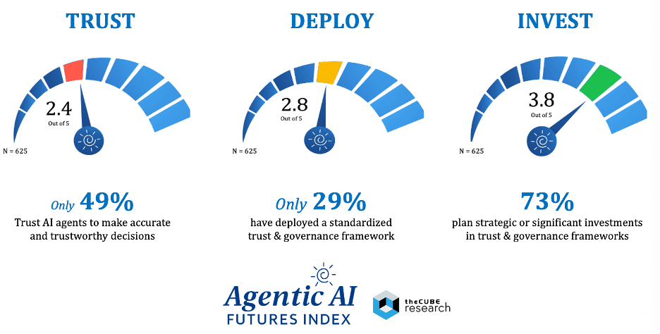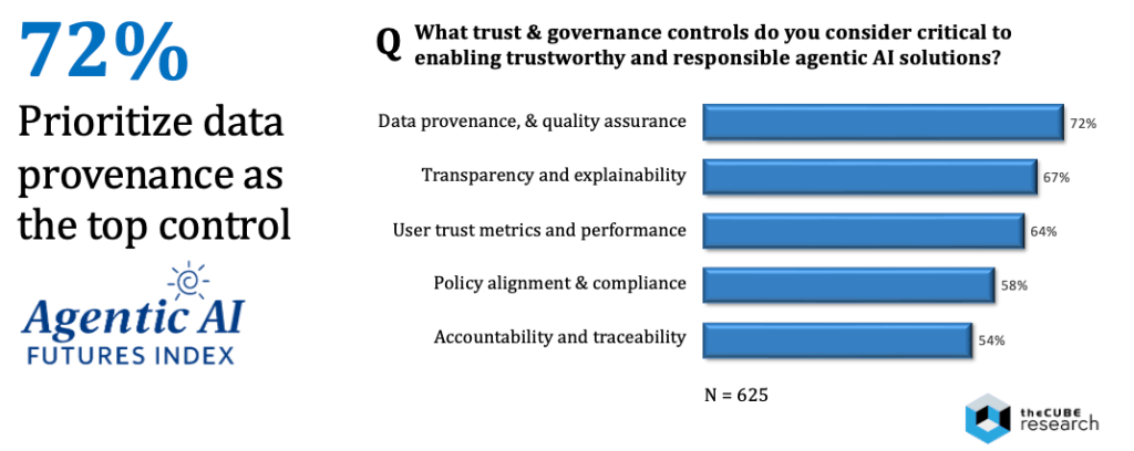 Enterprises increasingly agree. According to theCUBE Research’s Agentic AI Futures Index, 72% of leaders now prioritize data provenance as the single most critical control for enabling trustworthy and responsible AI. Close behind, 67% cite transparency and explainability. Policy alignment, compliance readiness, accountability, and traceability all follow as additional enterprise imperatives by a majority of enterprises surveyed.