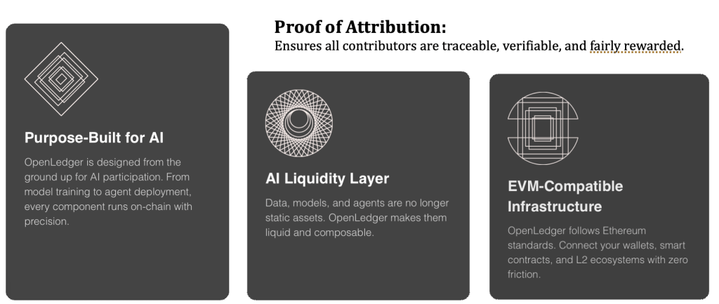 To achieve this, they are developing an on-chain attribution protocol that serves as the economic and verification layer for the AI ecosystem. Unlike today’s AI supply chains, which are fragmented, closed, and unverifiable, OpenLedger’s innovative architecture promotes transparency and trust by using blockchain to cryptographically ensure integrity, transparency, and trust: