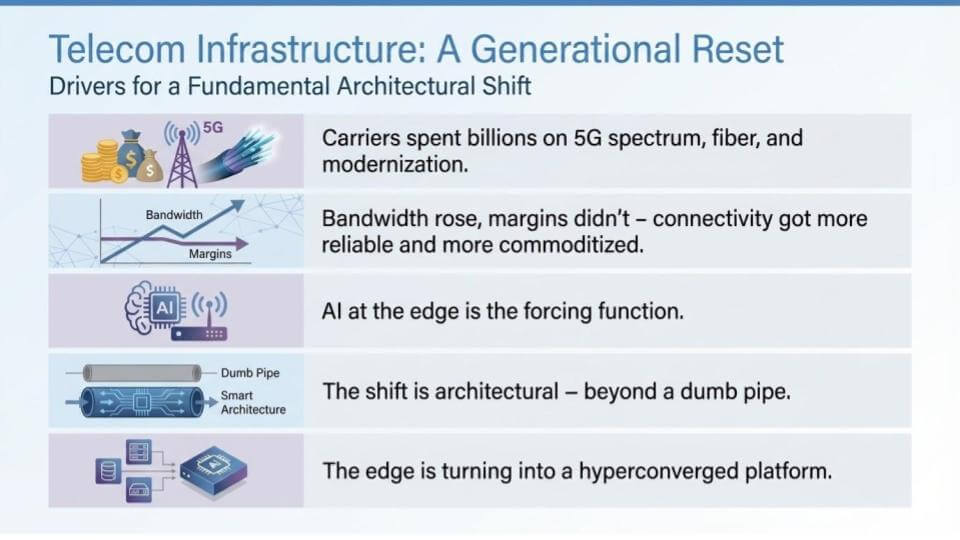 Telecom is entering a generational reset. Carriers spent billions on 5G spectrum, fiber, and modernization. Bandwidth rose, cost per bit fell, and connectivity became more reliable and more commoditized. The edge is now the forcing function because the economics are changing.