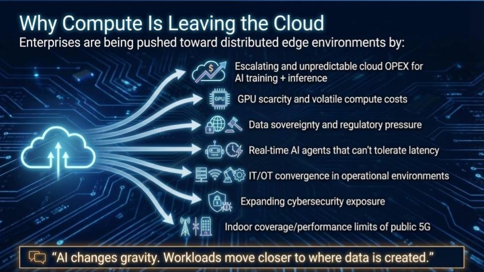Further, our view is that compute moves closer to where data is created. Think factories, hospitals, warehouses, retail stores, campuses. Why is this? We cite the following contributors to this trend: 1) Cloud OpEx are rising; 2) GPUs, are in short supply; 3) Sovereignty edicts are on the upswing; and 4) Latency. AI agents need real time responsiveness.