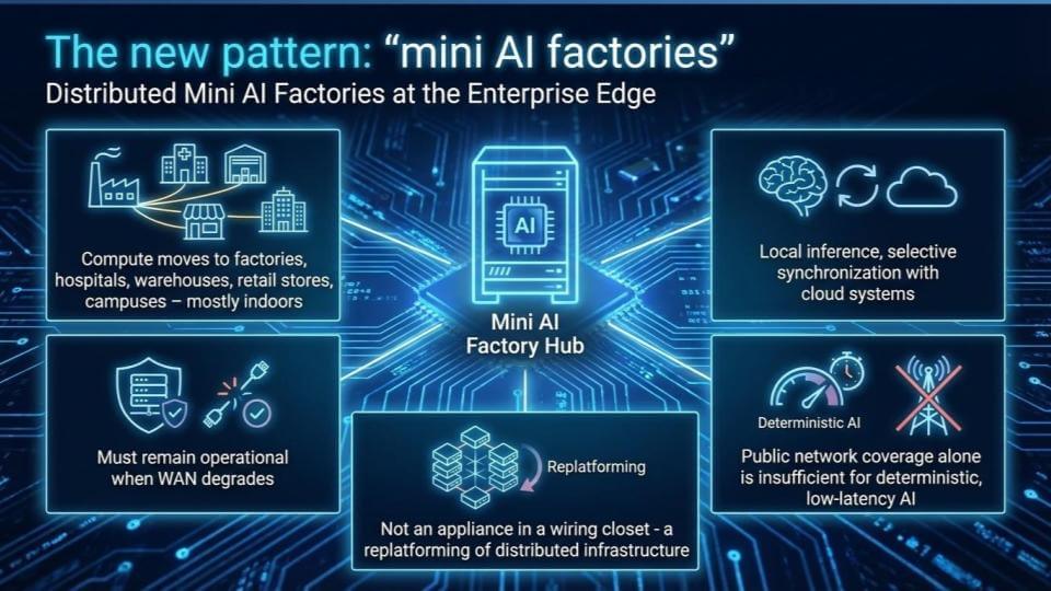 The edge is turning into a production environment. It’s no longer a branch office with a device in a closet. The mini AI factory idea is that compute moves into retail stores, warehouses, hospitals, campuses – mostly indoor locations – and those sites have to stay up when WAN performance degrades. Local inference must often run in real time. Cloud synchronization will happen when it can, but the production work can’t depend on it, it must be real time.