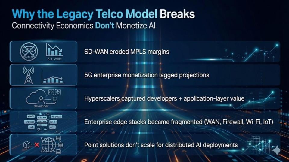 The telco business model has been trapped in a familiar loop. Massive investment goes into fiber and spectrum. Connectivity improves. Cost per bit keeps falling. Over-the-top players capture the relationship with the user and most of the upside. Some carriers tried to move up the stack into content and it didn’t work. 5G was supposed to be the monetization lever – it wasn’t. Carriers built a better network and the market forced prices down anyway.