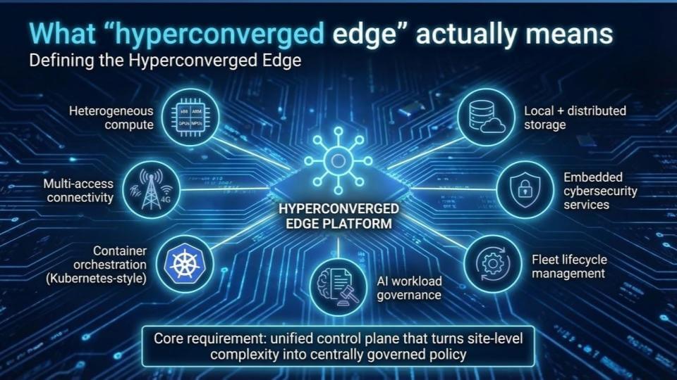 The simplest way to understand the hyperconverged edge is compute, networking, storage, and Wi-Fi (and more) brought together at the edge in a small container system, operated through a unified control plane. The requirement is turning site-level complexity into centrally managed, governed policy so it works the same way across thousands of locations.
