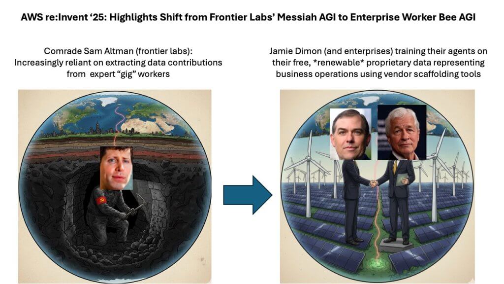 At AWS re:Invent 2025, Amazon faced a dual mandate – speak to millions of long-standing cloud customers while countering a persistent narrative that the company is lagging in AI. In our view, AWS chose a distinctly pragmatic path. Rather than chasing the holy grail of what we call messiah AGI or even competing head-on with frontier-scale LLMs, the company emphasized foundational agentic scaffolding and customizable large and small language models. This approach aligns with our thesis that the real near-term value in AI lies inside the enterprise – what we see as “worker-bee AGI” – not in aspirational, generalized intelligence.